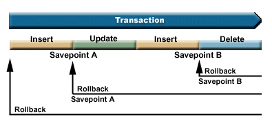위 코드에서 주의할 점은 18번 줄의 ROLLBACK TO문은 지정된 SAVEPOINT 이후의 트랜잭션을 취소하라는 문장이지 8번 줄로 되돌아가서 그 지점부터 다시 실행하라는 의미는 아니다. SAVEPOINT p1 이후의 트랜잭션만을 취소할 뿐이며 실행은 20번 줄로 계속 진행되어 롤백되지 않은 6번 줄의 INSERT문에 의한 변경을 커밋한다.