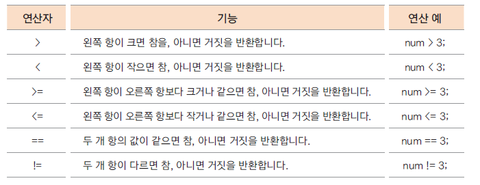 - 연산의 결과가 true(참), false(거짓)으로 반환 됨