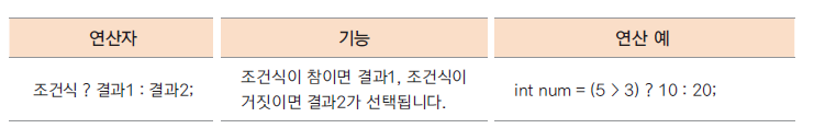 - 조건식의 결과가 true(참)인 경우와 false(거짓)인 경우에 따라 다른 결과가 수행됨