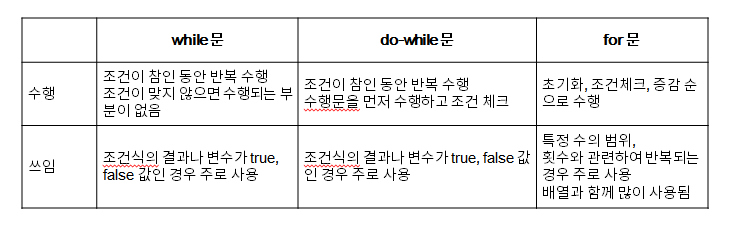 - 증감식 생략 : 증감식에 대한 연산이 복잡하거나 다른 변수의 연산 결과값에 결정되는 경우
