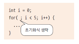 - 초기화식 생략 : 이미 이전에 값이 초기화 되어 for 내부에서 값을 지정할 필요가 없는 경우